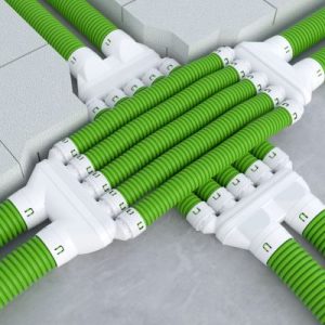 Mit Hilfe von Adaptern ist es möglich, flexible PE-FLEX®-Lüftungsrohre zu kreuzen, ohne das Styropor in der Bodendämmschicht zu überschreiten: