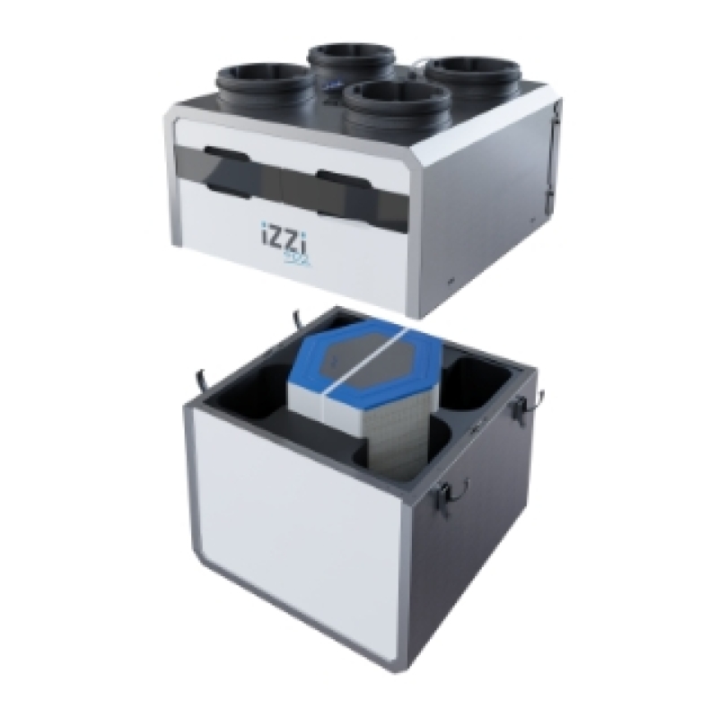 iZZi 402 ERV ist der erste Rekuperator auf dem Markt mit einem kompakten zweiteiligen Gehäuse! Es ermöglicht die einzelne Wandmontage der Anlage und einen einfachen Wartungszugang zu allen Komponenten. Es passt perfekt über die Waschmaschine oder den Kühlschrank. Der iZZi 402 Rekuperator verfügt standardmäßig über einen Tauscher mit Feuchterückgewinnung (ERV) und erreicht eine Kapazität von 400 m³/h.