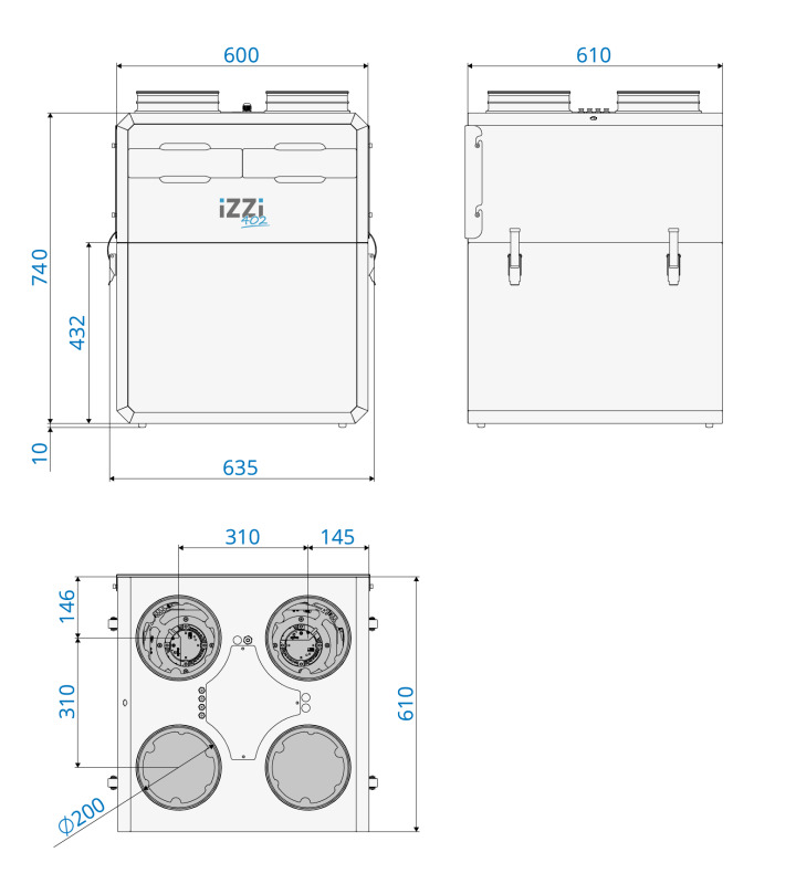 Dank der kompakten Abmessungen kann der iZZi 402 ERV Rekuperator auch in kleinen Räumen sogar in einem Schrank direkt über einem Kühlschrank oder einer Waschmaschine montiert werden. Die Wahl des Standorts wird auch dadurch erleichtert, dass kein Kondenswasser anfällt, d. h. es muss nicht in die Kanalisation abgeleitet werden.
