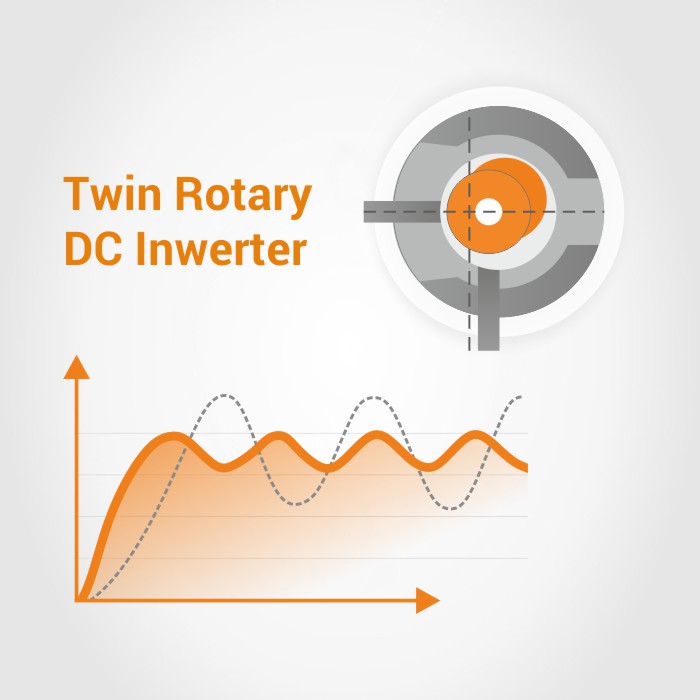 - Verdichter des Typs Twin Rotary DC Inverter mit stufenloser Leistungsregelung 30-100%
